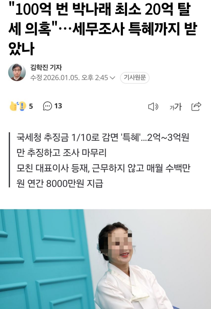 100억 번 박나래 최소 20억 탈세 의혹 < 이전글 목록으로 다음글 > 박장군 0 20 0 신고 01.06 09:28 https://www.lottoangel.co.kr/bbs/app_free/7262 복사 출처 https://naver.me/5HrH6bji 0 < 이전글 목록으로 다음글 >