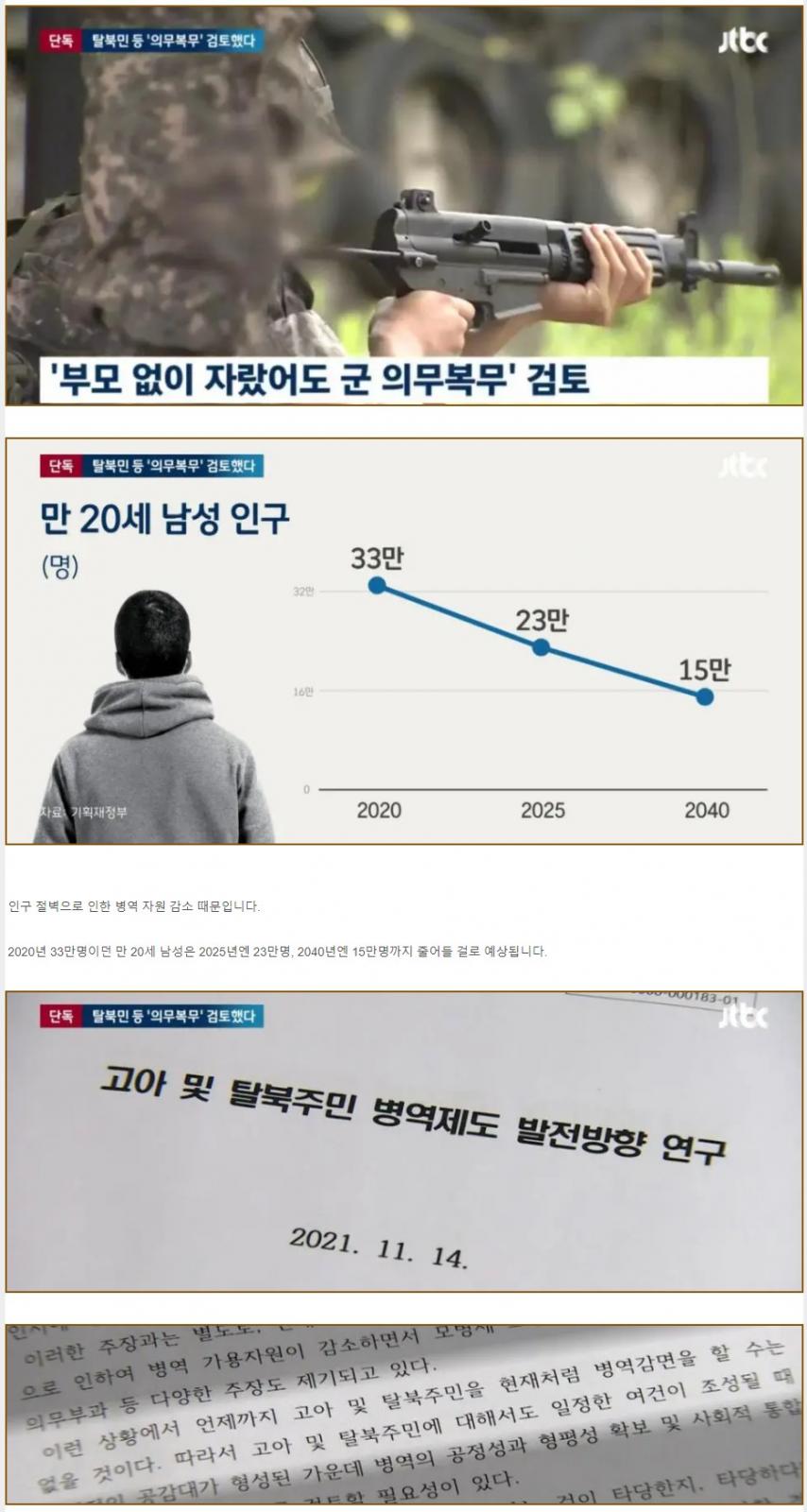 부모 없이 자란 고아와 탈북민까지 군복무 검토한 병무청 < 이전글 목록으로 다음글 > 토토가 0 750 0 신고 2023.10.14 17:14 https://www.lottoangel.co.kr/bbs/app_humor/2687 복사 해마다 강씨처럼 부모 없이 자란 청년 약 600명이 군 면제를 받습니다. 이들은 전시근로역으로 구분돼 전쟁이 일어나지 않는 한 군대에 가지 않습니다. 그런데 병무청이 부모 없이 자랐거나 탈북한 청년도 의무복무를 하는 방안을 검토한 사실이 JTBC 취재 결과 확인됐습니다. 병무청이 재작년 펴낸 정책연구보고서입니다. '언제까지 이들에게 현재처럼 병역 감면을 할 수는 없다'고 강조합니다. 병무청 관계자는 "보고서 내용을 국방부에 공유했다"면서도 "추가적으로 국방부와 협의된 내용은 없다"고 했습니다. 0 < 이전글 목록으로 다음글 >