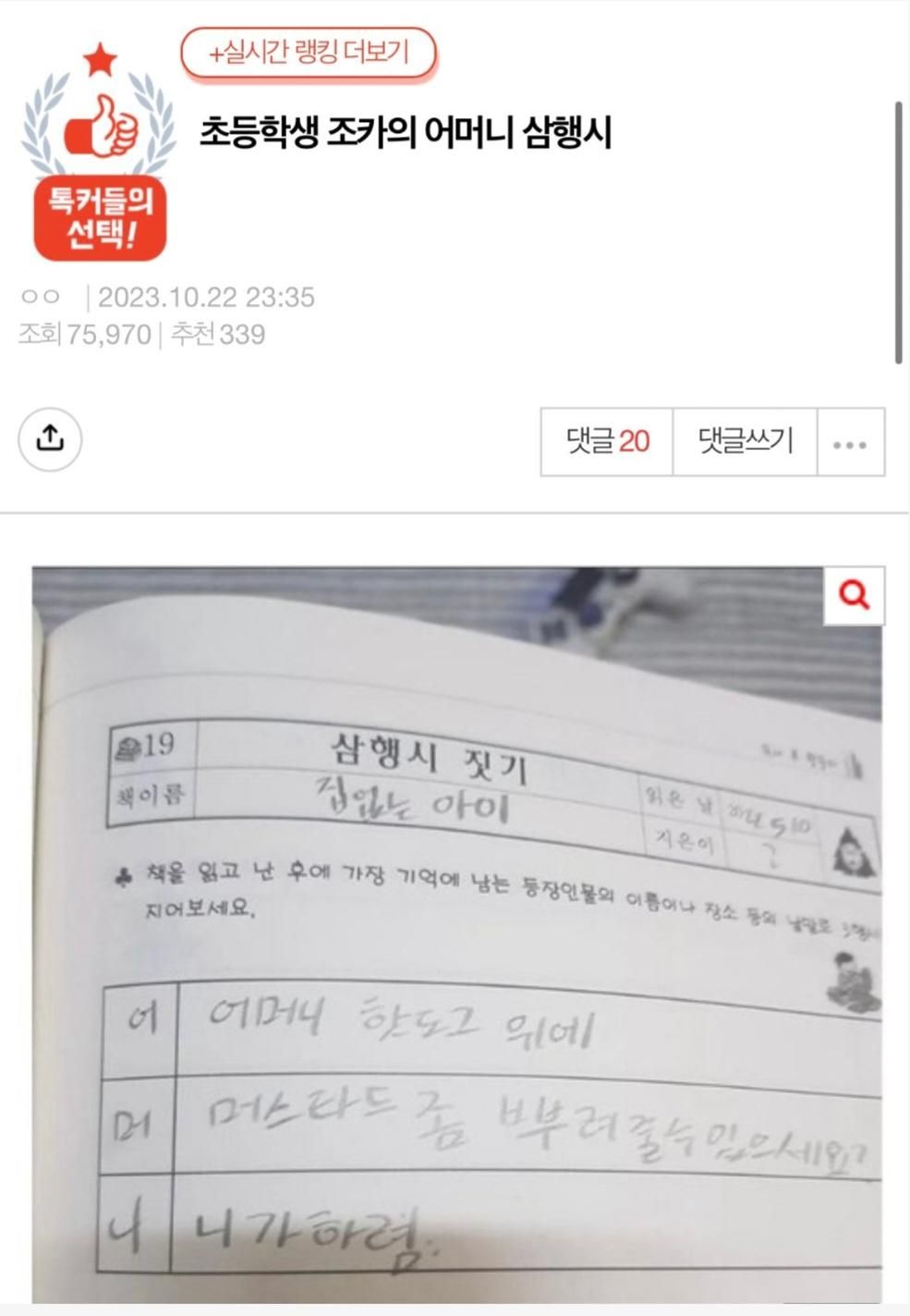 초딩 조카의 '어머니' 삼행시 < 이전글 목록으로 다음글 > 드루와 0 630 0 신고 2023.10.25 08:12 https://www.lottoangel.co.kr/bbs/app_humor/3148 복사 0 < 이전글 목록으로 다음글 >