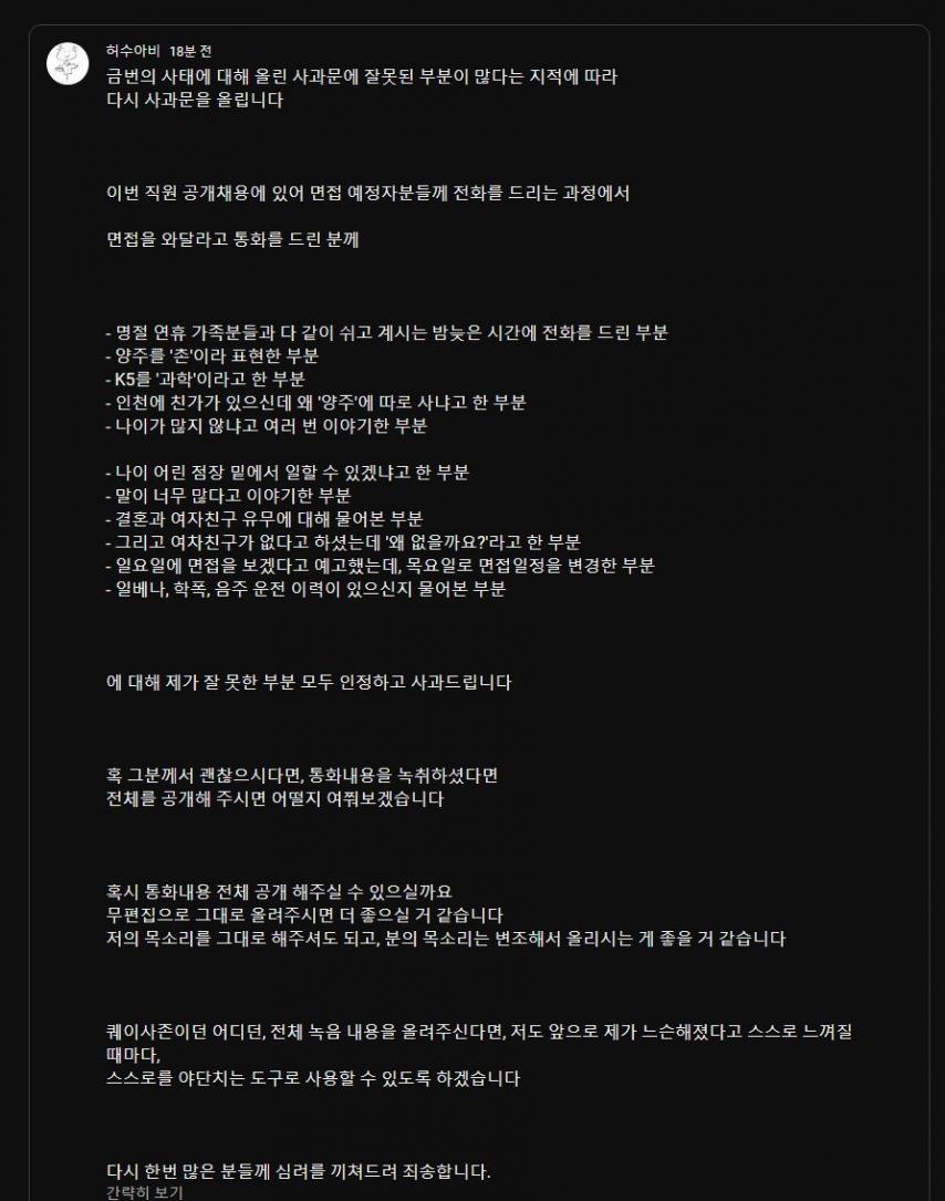 허수아비컴퓨터 면접 논란 < 이전글 목록으로 다음글 > 싼다팍 0 692 0 신고 2024.02.19 07:07 https://www.lottoangel.co.kr/bbs/app_humor/4902 복사 요약면접자에게 1. 양주 거기 촌동네 잖아? 거기 왜 삶?ㅋㅋ2. K5 그거 과학이라는데ㅋㅋ3. 당신 말이 너무 많아 내가 질문했을때 짧게 해줘 4. 여자친구가 없다고? 왜 없을까?ㅋㅋ실무랑 전혀 상관없는 질문에 빡친 면접자가 퀘이사존에 글올리니 4과문 올림여론 나빠지니 2차 4과문 올렸는데 여기서 녹음한거 다 올려달라며 되도 않는 억지 부리기 시작여론 나락가고 면접자가 선넘지 말라며 사태 마무리 0 < 이전글 목록으로 다음글 >
