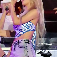 빨간 체크 튜브탑 앞으로 숙인 뭉클 가슴골 에스파 카리…