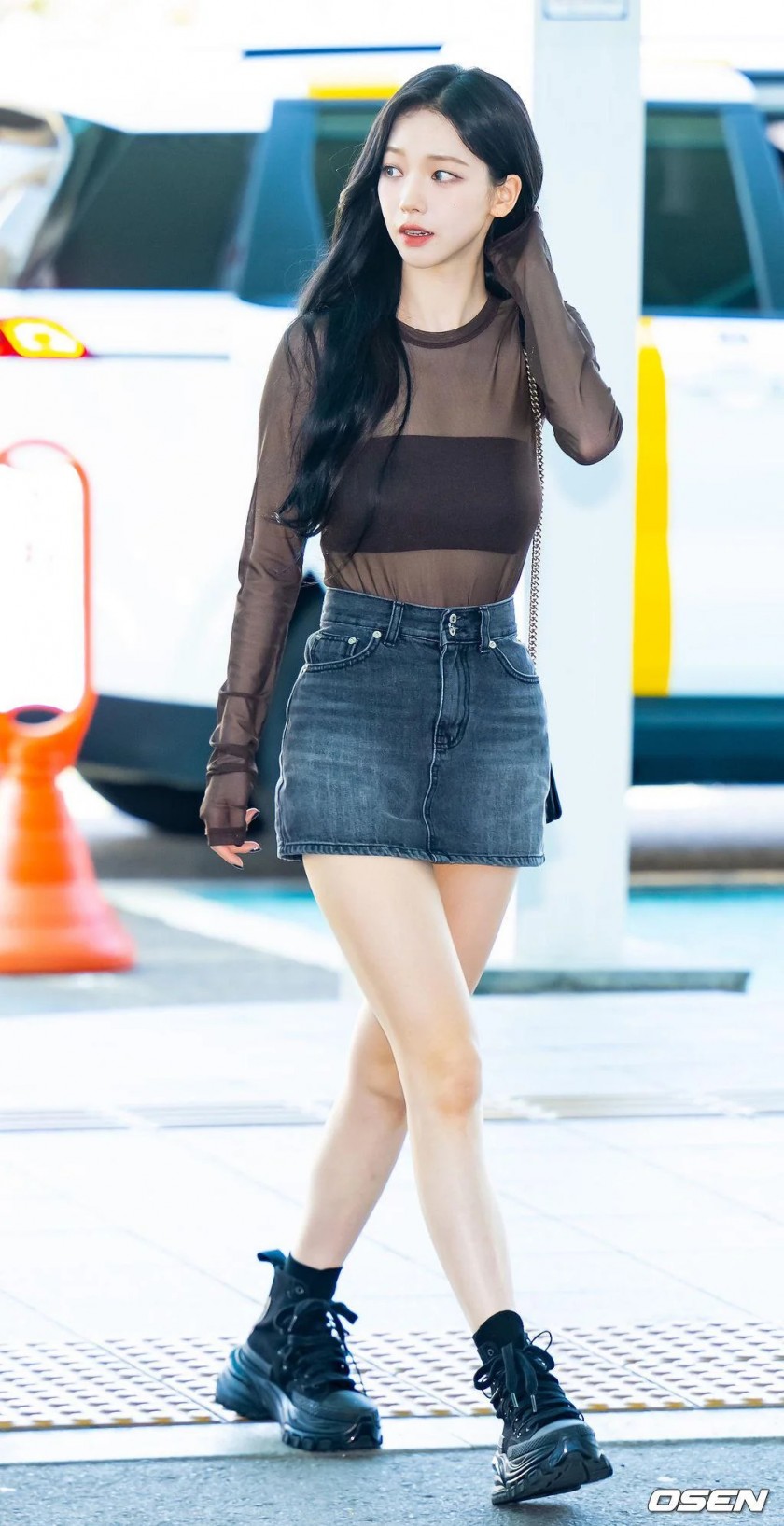 검정 튜브탑 시스루 공항패션 에스파 카리나